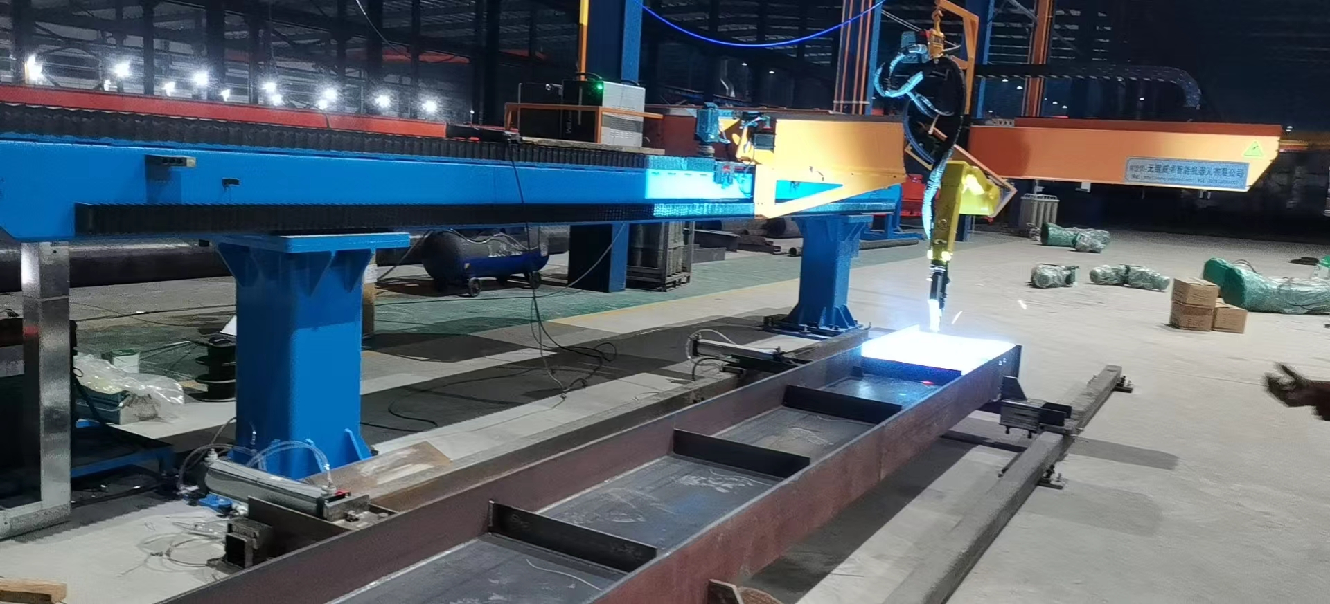 智能焊接在鋼構(gòu)行業(yè)的成功應(yīng)用針對鋼結(jié)構(gòu)中常見的H型鋼等鋼梁工件,威卓設(shè)計(jì)研發(fā)了小龍門智能焊接工作站,焊槍部分使用鋼梁專用焊槍,更適用于鋼梁焊接;搭配傳感器使用,自動(dòng)尋位識別焊縫,無